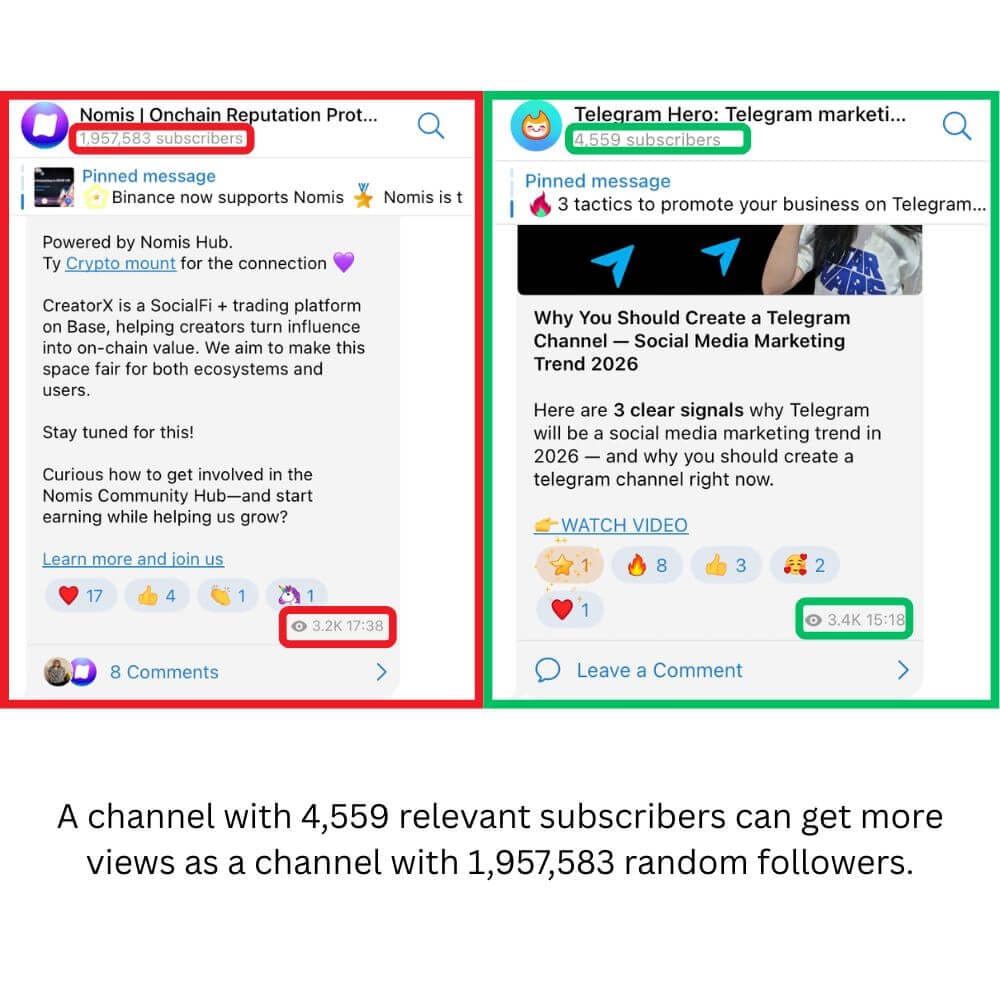 For example, one of my channels about Telegram marketing has 4,559 relevant subscribers and gets more views than a channel with 1,957,583 random followers. And it works the same way with clients.