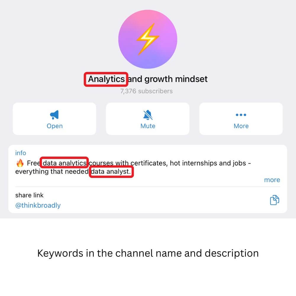 Including your main keyword in your channel name and description. This helps people find your channel in Telegram search and allows your channel to appear as a recommended similar channel.