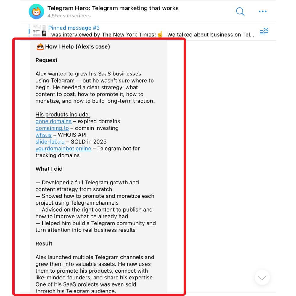 The post below demonstrates a real example of how Telegram can be used to grow and monetize a business. It shows the client’s initial problem, the strategy that was implemented, and the results achieved.