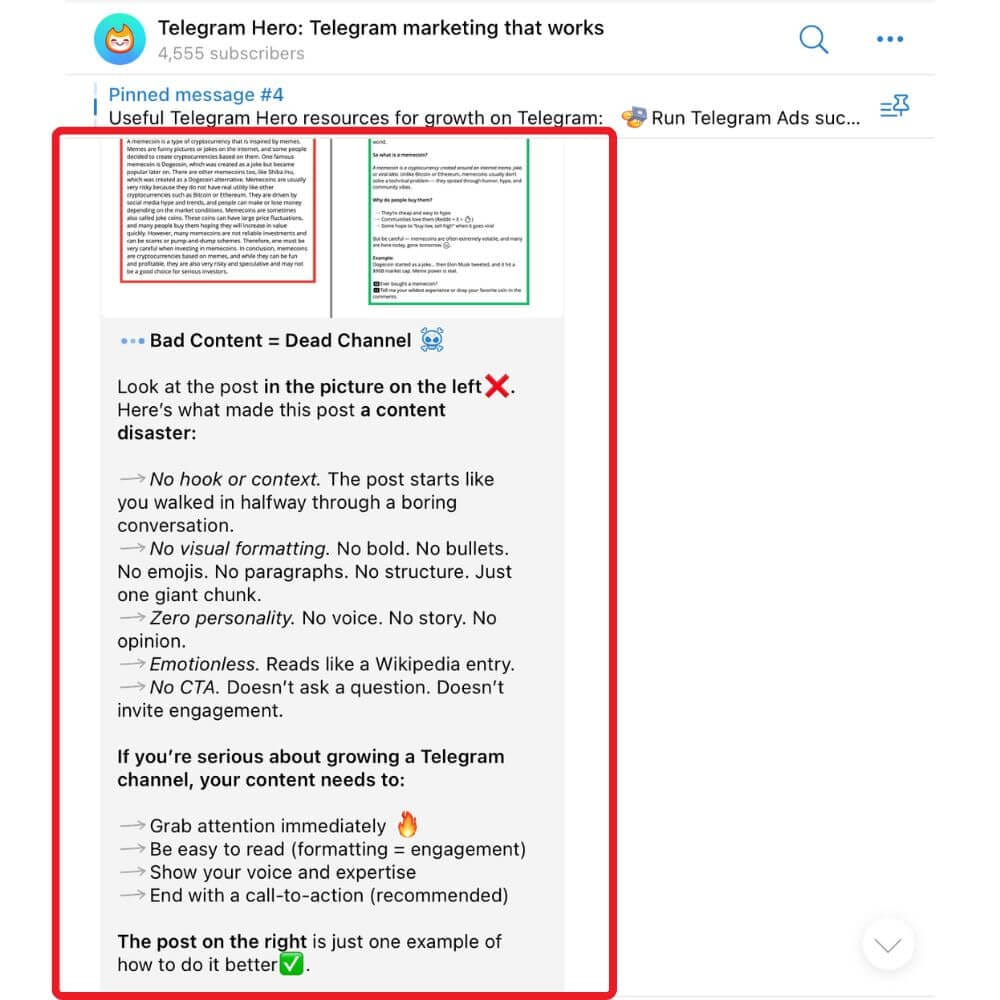 This type of content demonstrates expertise because it analyzes real examples, explains the reasoning, and teaches readers how to improve their own Telegram posts.